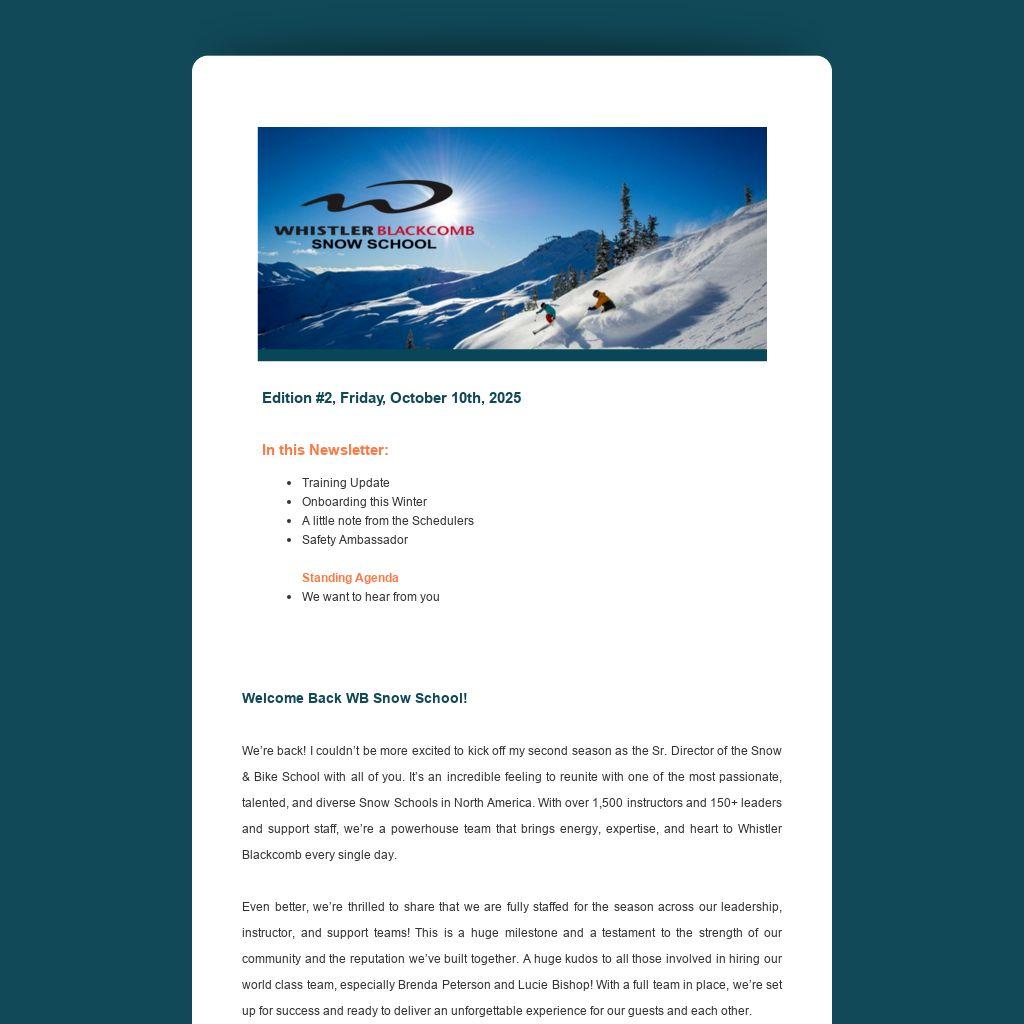 If you received this newsletter and are no longer returning this winter to Whistler Blackcomb Snow School, please reach out to your manager.