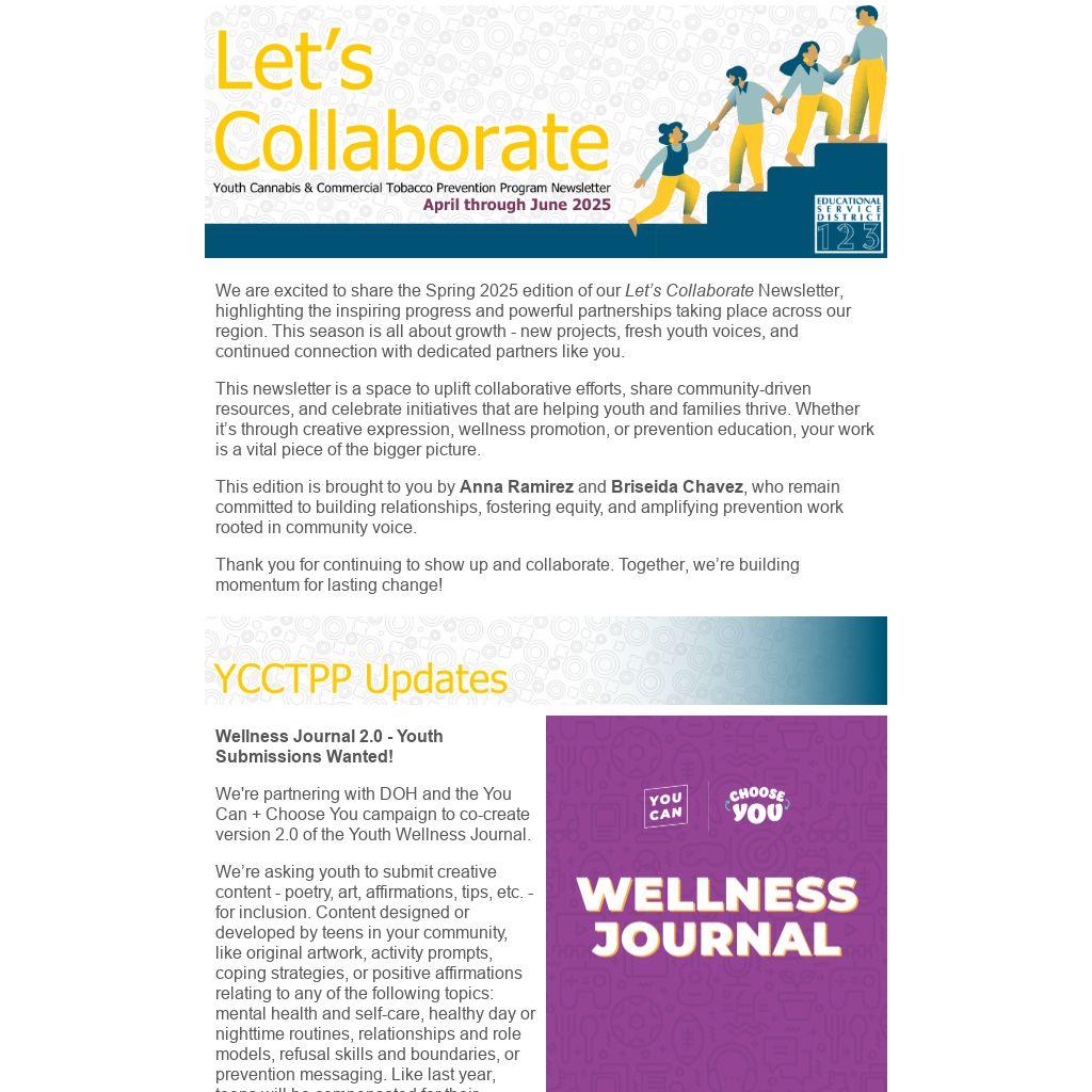 We are excited to share the Spring 2025 edition of our Let’s Collaborate Newsletter, highlighting the inspiring progress and powerful partnerships taking place across our region. This season is all about growth - new projects, fresh youth voices, and continued connection with dedicated partners like you.