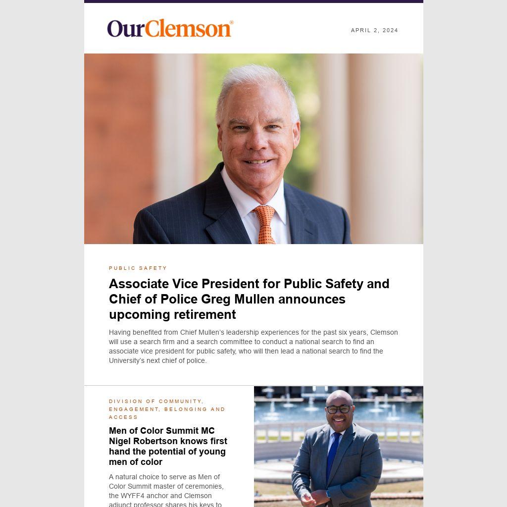 Having benefited from Chief Mullen’s leadership experiences for the past six years, Clemson will use a search firm and a search committee to conduct a national search to find an associate vice president for public safety, who will then lead a national search to find the University’s next chief of police.