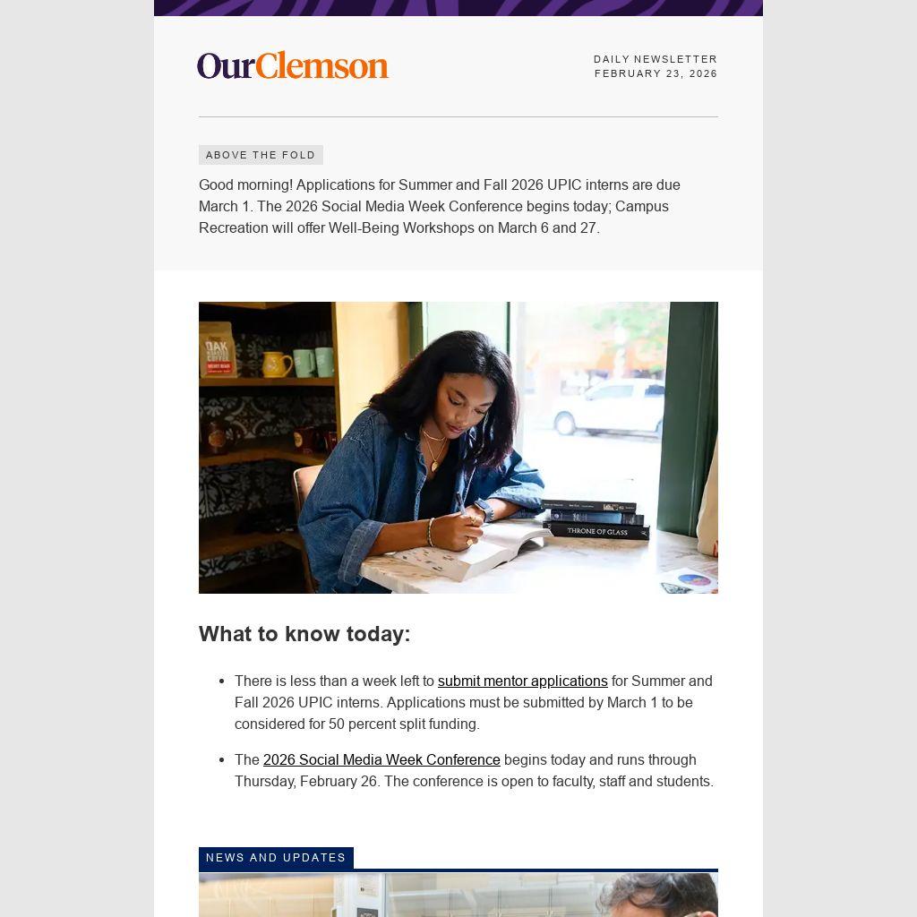 Good morning! Applications for Summer and Fall 2026 UPIC interns are due March 1. The 2026 Social Media Week Conference begins today; Campus Recreation will offer Well-Being Workshops on March 6 and 27.