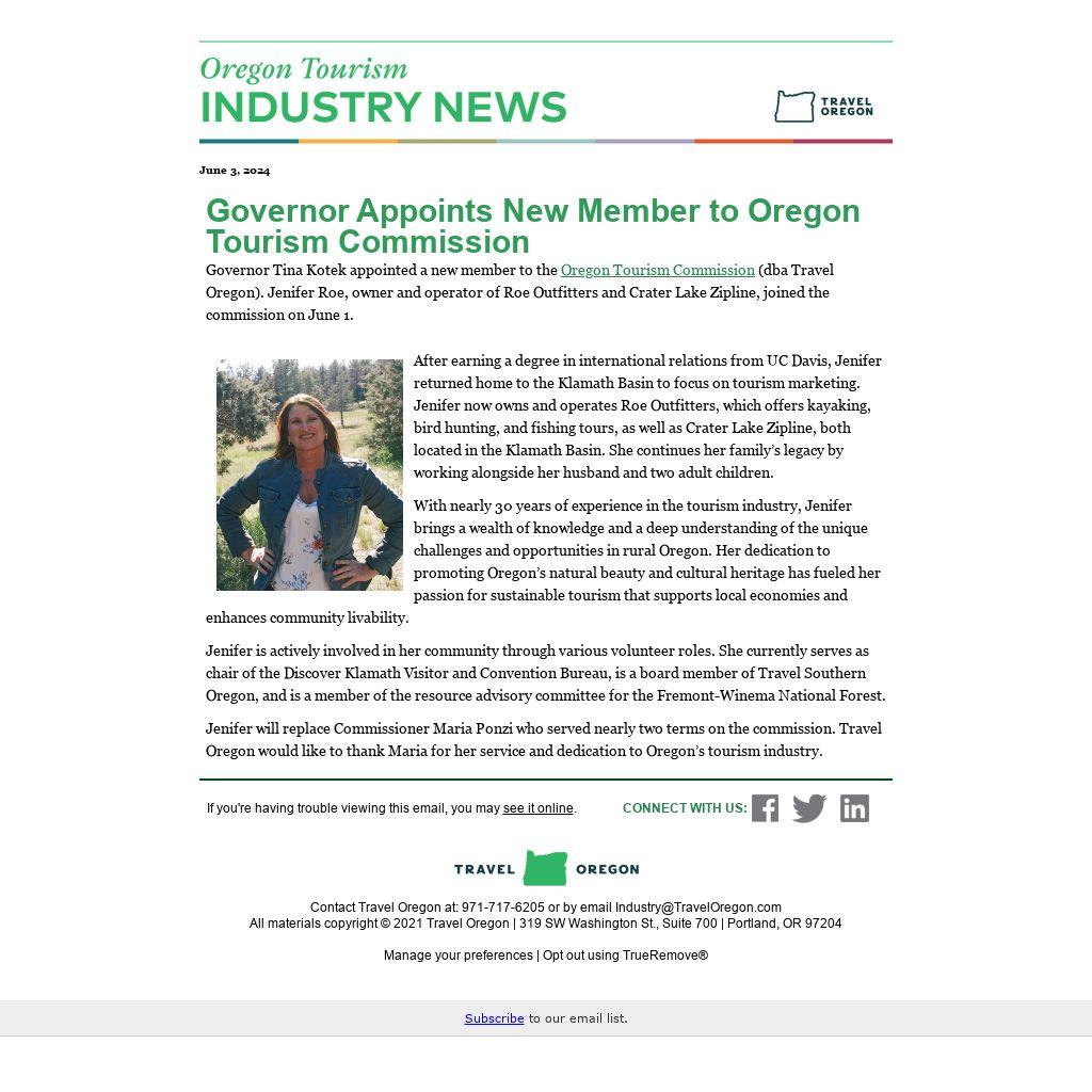 Jenifer will replace Commissioner Maria Ponzi who served nearly two terms on the commission. Travel Oregon would like to thank Maria for her service and dedication to Oregon’s tourism industry.