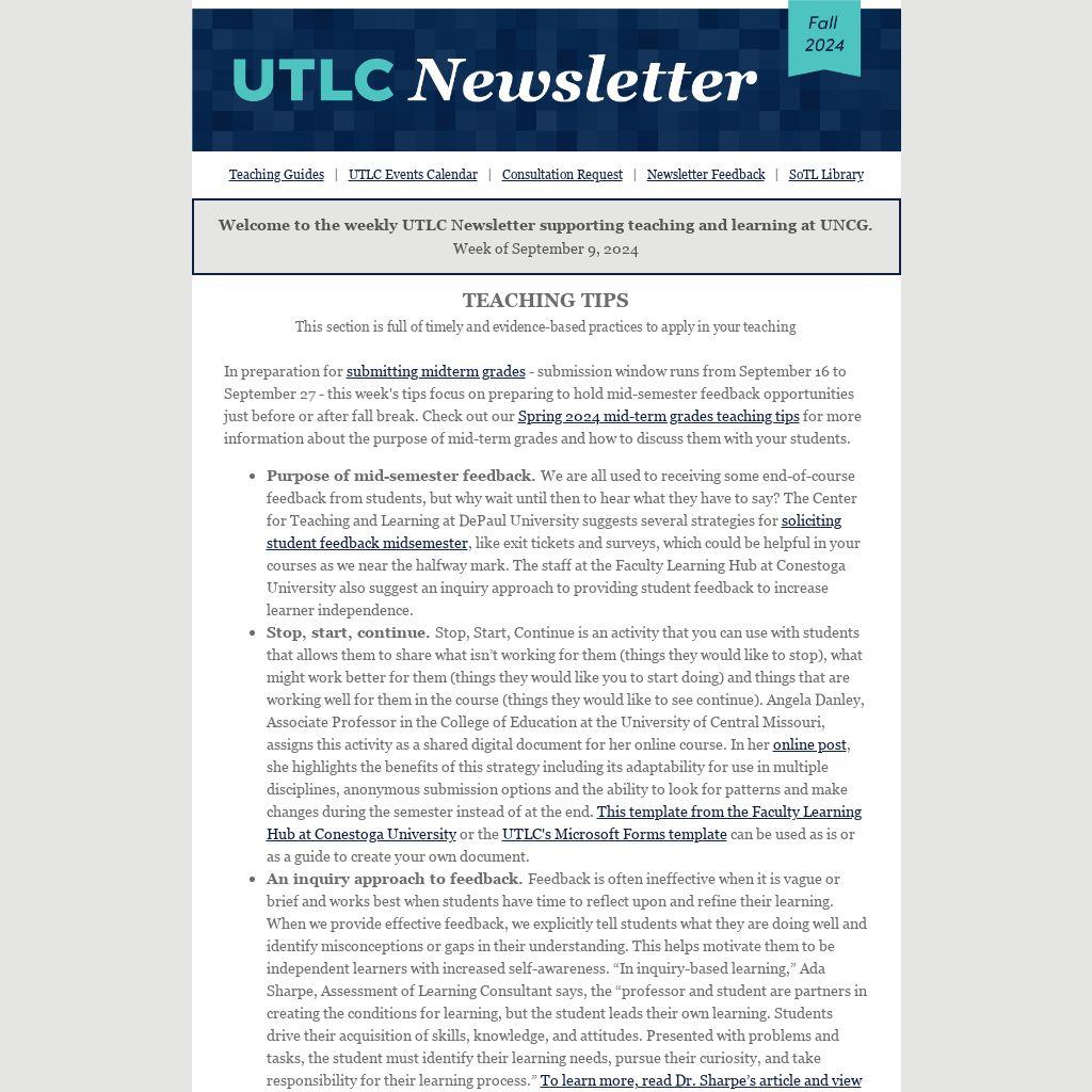 Welcome to the weekly UTLC Newsletter supporting teaching and learning at UNCG.