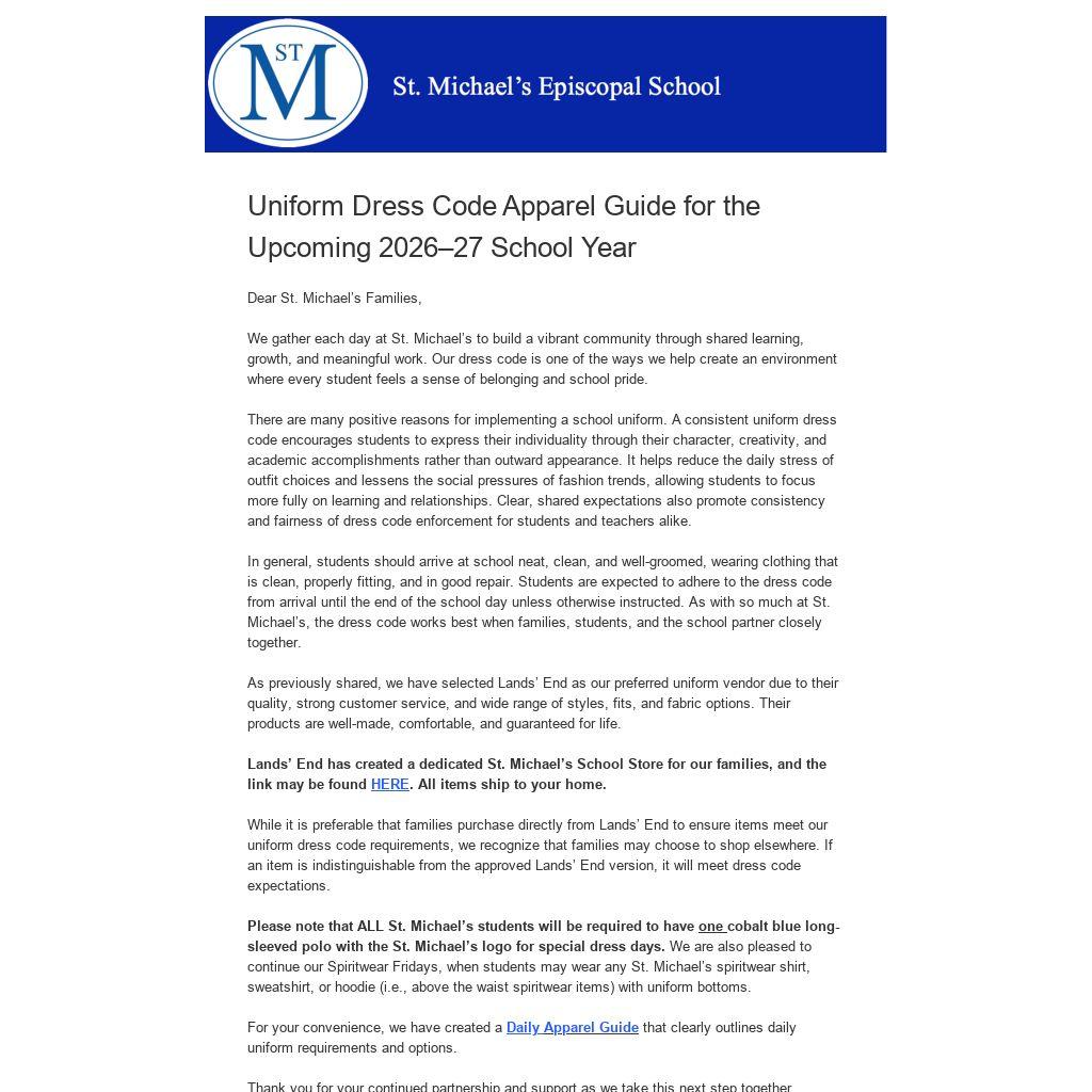 Lands’ End has created a dedicated St. Michael’s School Store for our families, and the link may be found HERE. All items ship to your home.