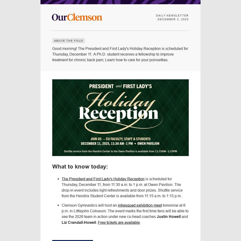 Good morning! The President and First Lady's Holiday Reception is scheduled for Thursday, December 11. A Ph.D. student receives a fellowship to improve treatment for chronic back pain; Learn how to care for your poinsettias.