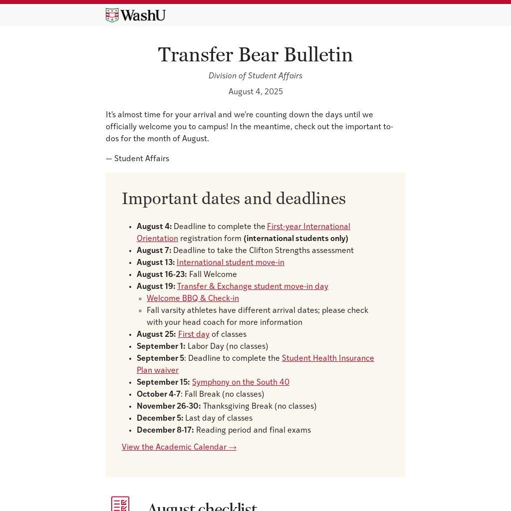 * Move-In Day for international students attending WashU on a visa is Tuesday, August 19. Fall varsity athletes have different arrival dates; please check with your head coach for more information.