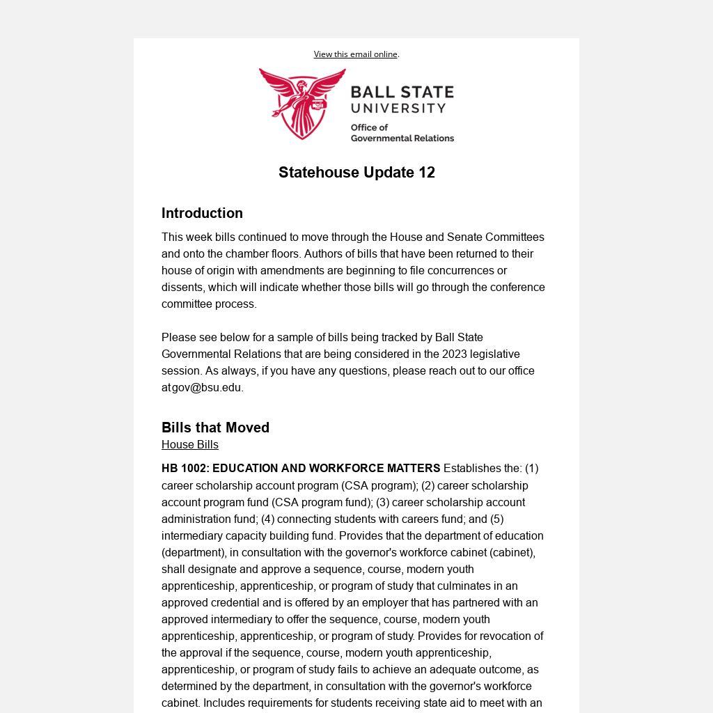 Please see below for a sample of bills being tracked by Ball State Governmental Relations that are being considered in the 2023 legislative session. As always, if you have any questions, please reach out to our office at gov@bsu.edu.