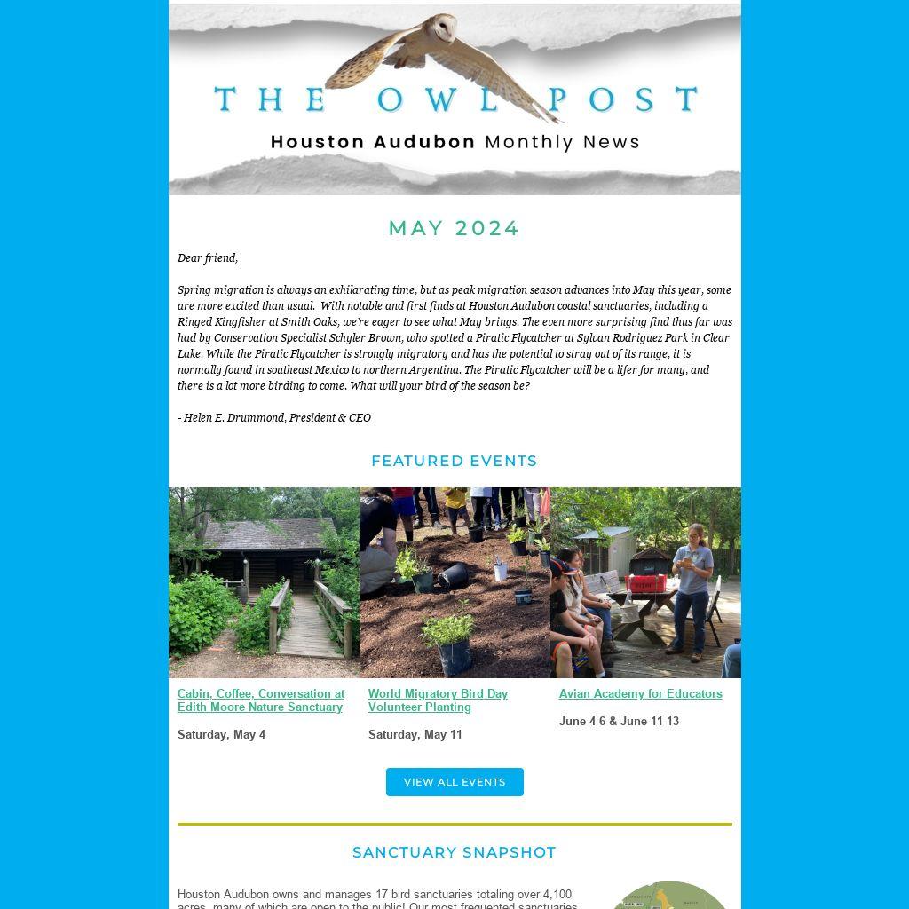 Houston Audubon owns and manages 17 bird sanctuaries totaling over 4,100 acres, many of which are open to the public! Our most frequented sanctuaries include the Edith L. Moore Nature Sanctuary in west Houston and our High Island and Bolivar Flats sanctuaries on the coast.Â