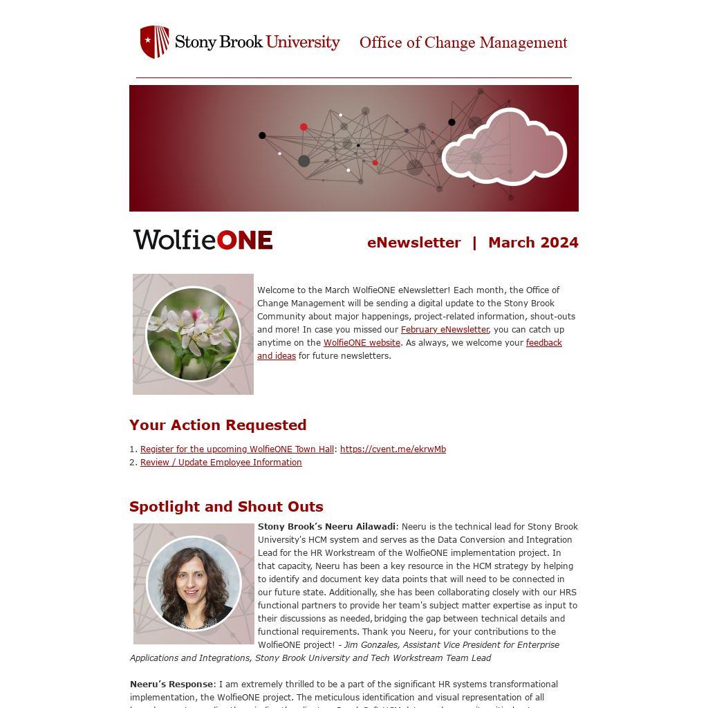 Welcome to the March WolfieONE eNewsletter! Each month, the Office of Change Management will be sending a digital update to the Stony Brook Community about major happenings, project-related information, shout-outs and more! In case you missed our February eNewsletter, you can catch up anytime on the WolfieONE website. As always, we welcome your feedback and ideas for future newsletters.