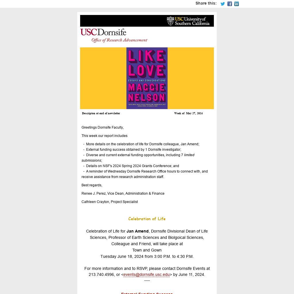 - More details on the celebration of life for Dornsife colleague, Jan Amend; - External funding success obtained by 1 Dornsife investigator; - Diverse and current external funding opportunities, including 7 limited submissions; - Details on NSF's 2024 Spring 2024 Grants Conference; and - A reminder of Wednesday Dornsife Research Office hours to connect with, and receive assistance from research administration staff.