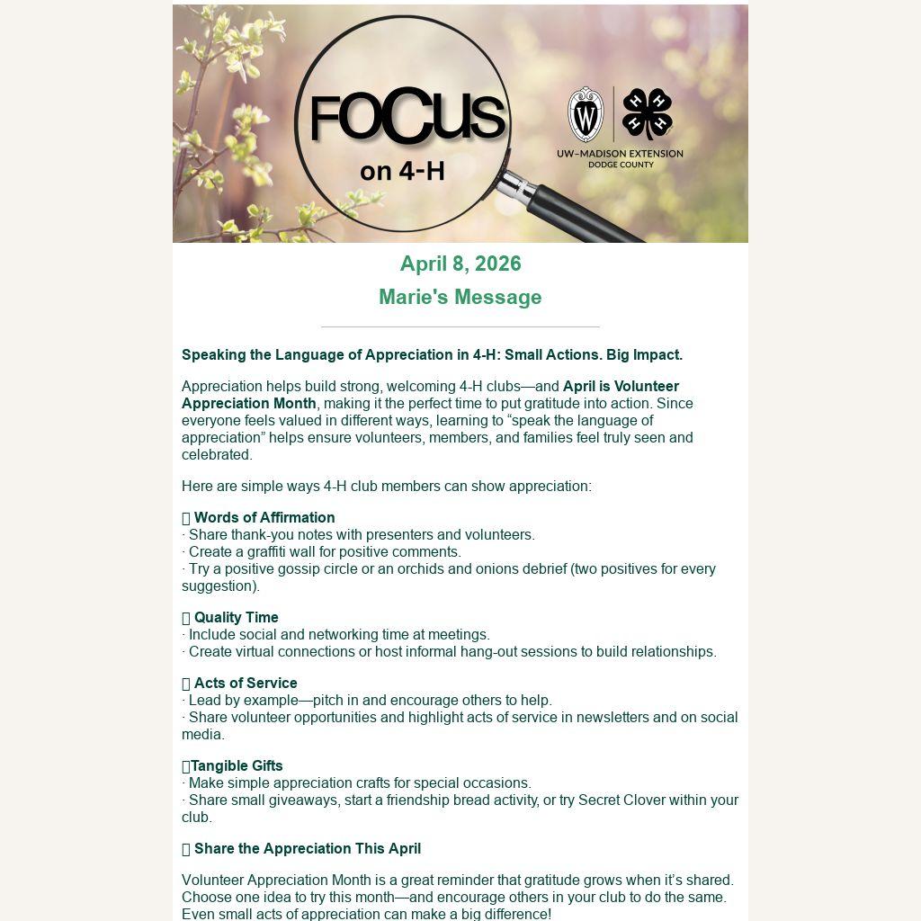 Appreciation helps build strong, welcoming 4-H clubs—and April is Volunteer Appreciation Month, making it the perfect time to put gratitude into action. Since everyone feels valued in different ways, learning to “speak the language of appreciation” helps ensure volunteers, members, and families feel truly seen and celebrated.