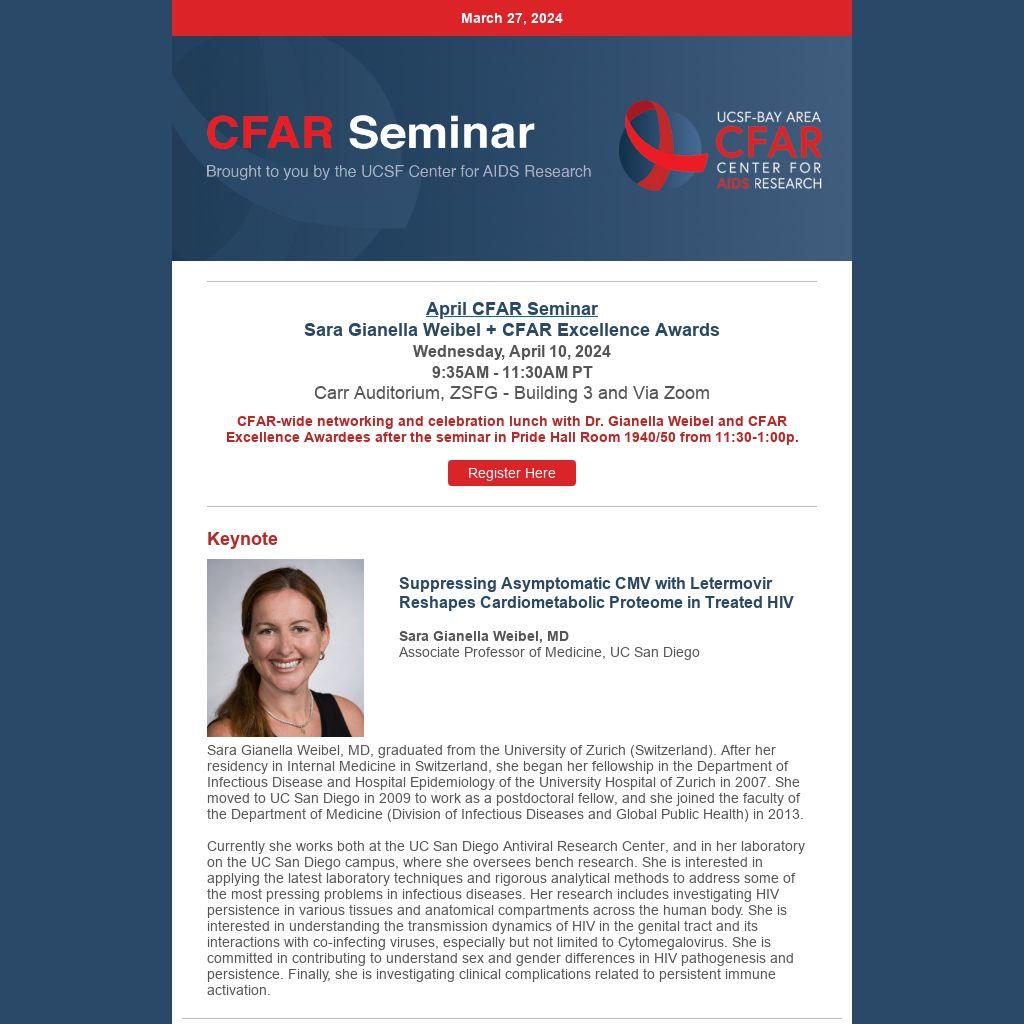 CFAR-wide networking and celebration lunch with Dr. Gianella Weibel and CFAR Excellence Awardees after the seminar in Pride Hall Room 1940/50 from 11:30-1:00p.
