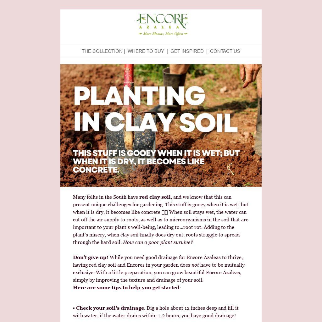 Don’t give up! While you need good drainage for Encore Azaleas to thrive, having red clay soil and Encores in your garden does not have to be mutually exclusive. With a little preparation, you can grow beautiful Encore Azaleas, simply by improving the texture and drainage of your soil.