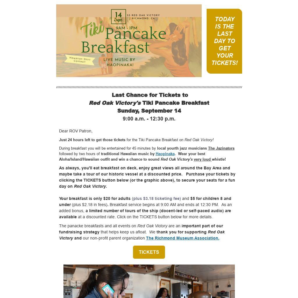 Just 24 hours left to get those tickets for the Tiki Pancake Breakfast on Red Oak Victory!