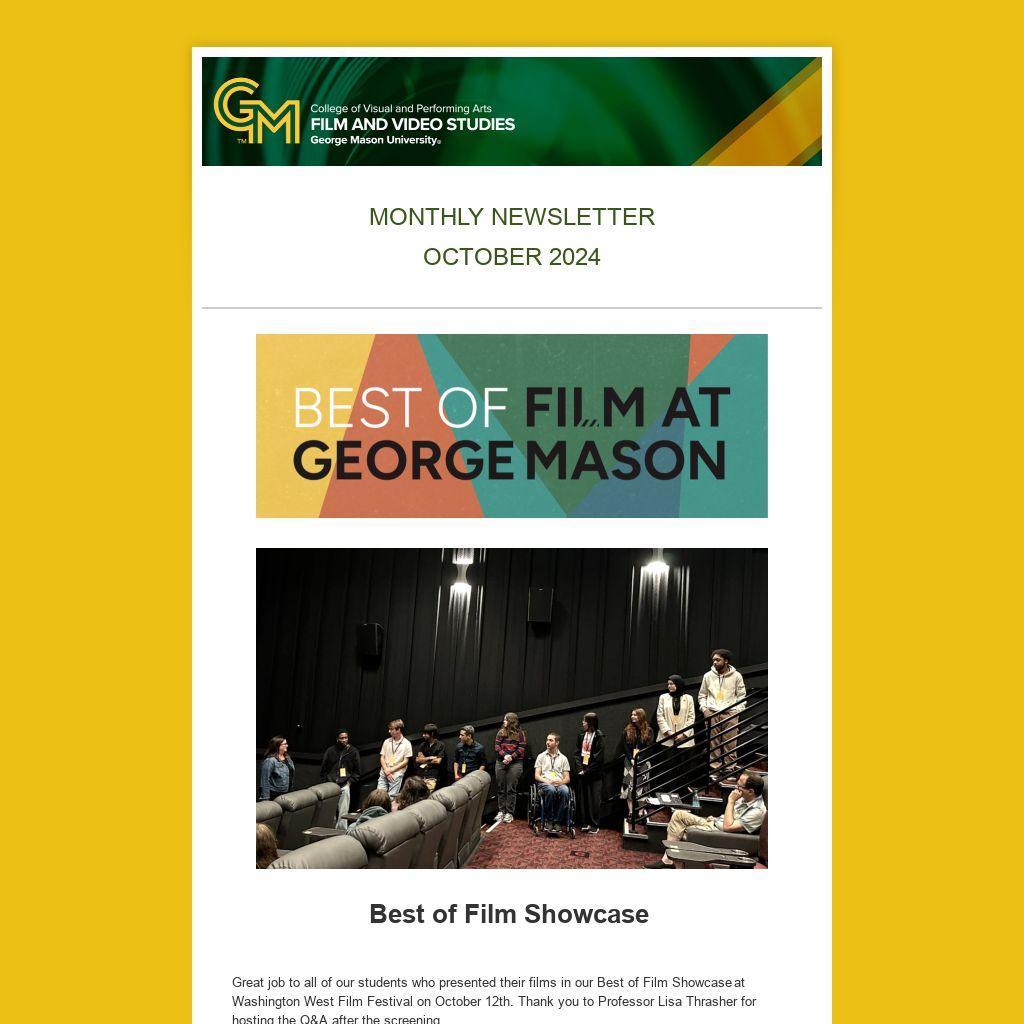 We want to hear from you! If you have news you would like to contribute, please send it to film@gmu.edu. We are looking for regional film events and updates from Film at Mason alumni. Keep up-to-date on all the current Film at Mason news at film.gmu.edu.
