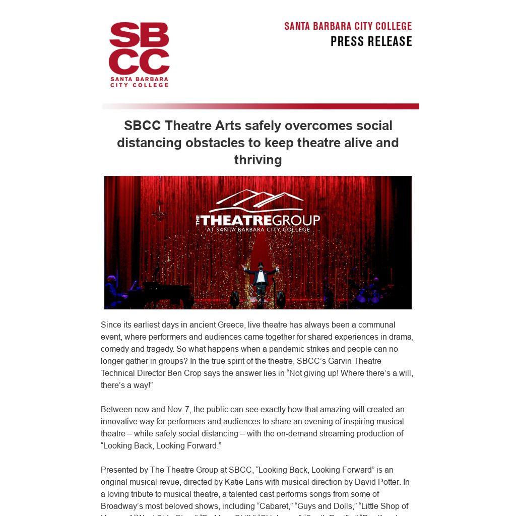 Presented by The Theatre Group at SBCC, “Looking Back, Looking Forward” is an original musical revue, directed by Katie Laris with musical direction by David Potter. In a loving tribute to musical theatre, a talented cast performs songs from some of Broadway’s most beloved shows, including “Cabaret,” “Guys and Dolls,” “Little Shop of Horrors,” “West Side Story,” “Be More Chill,” “Oklahoma,” “South Pacific,” “Rent” and many more. Tickets for this streaming event can be purchased at: www.theatregroupsbcc.com/now-playing