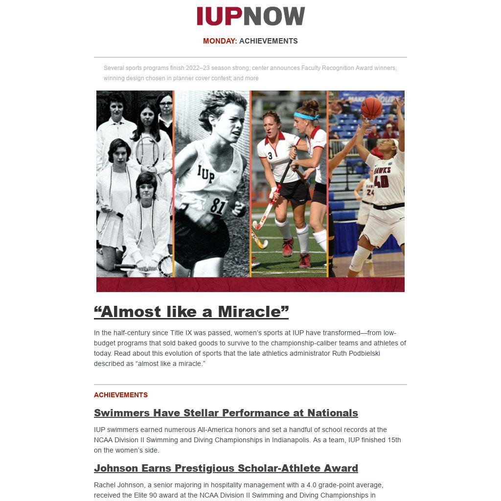 Distributed to IUP employees and students twice a week, IUP Now is the official newsletter of Indiana University of Pennsylvania. It features news from across the IUP website, compiled by the Division of Marketing and Communications. Find out how to get your news and events in IUP Now.