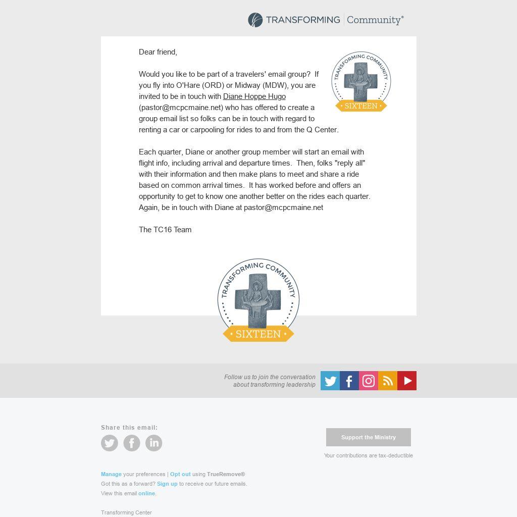 Diane Hoppe Hugo (pastor@mcpcmaine.net) who has offered to create a group email list so folks can be in touch with regard to renting a car or carpooling for rides to and from the Q Center.