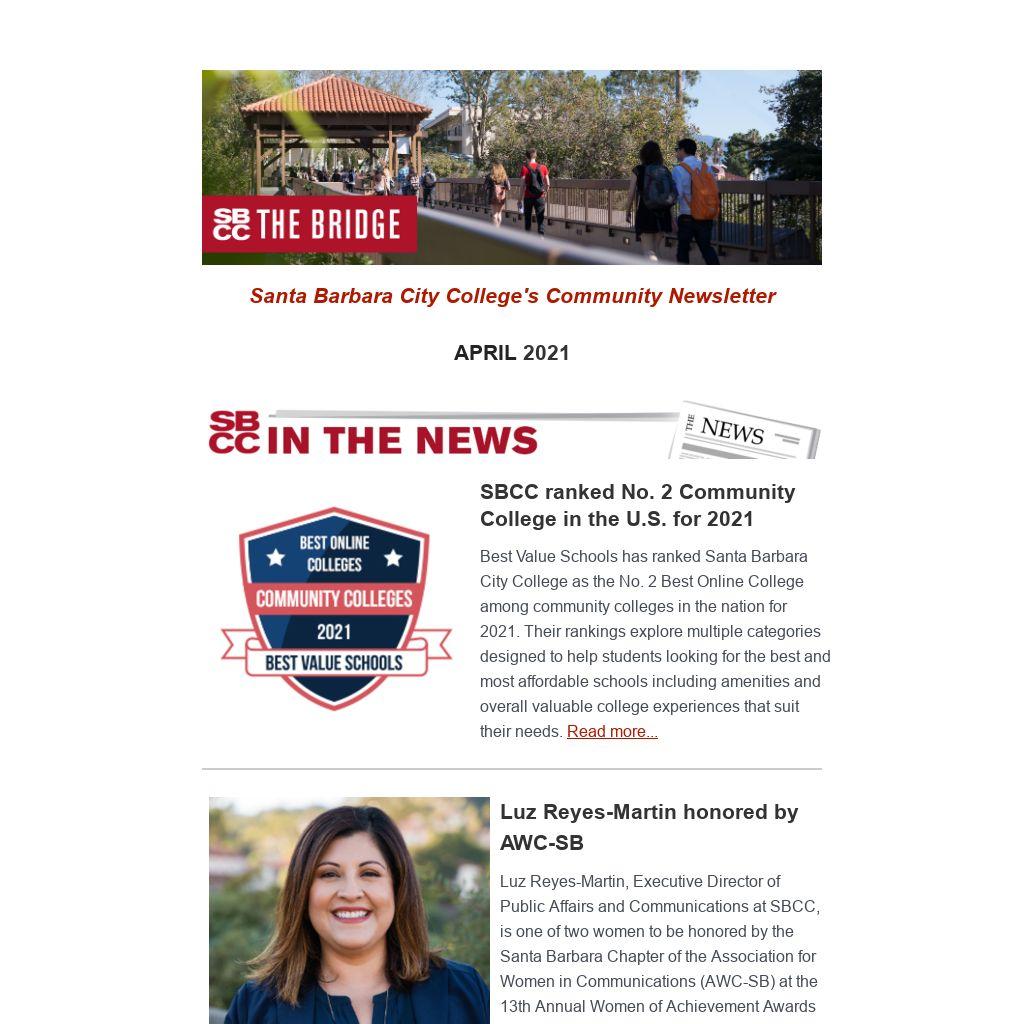 Best Value Schools has ranked Santa Barbara City College as the No. 2 Best Online College among community colleges in the nation for 2021. Their rankings explore multiple categories designed to help students looking for the best and most affordable schools including amenities and overall valuable college experiences that suit their needs. Read more...