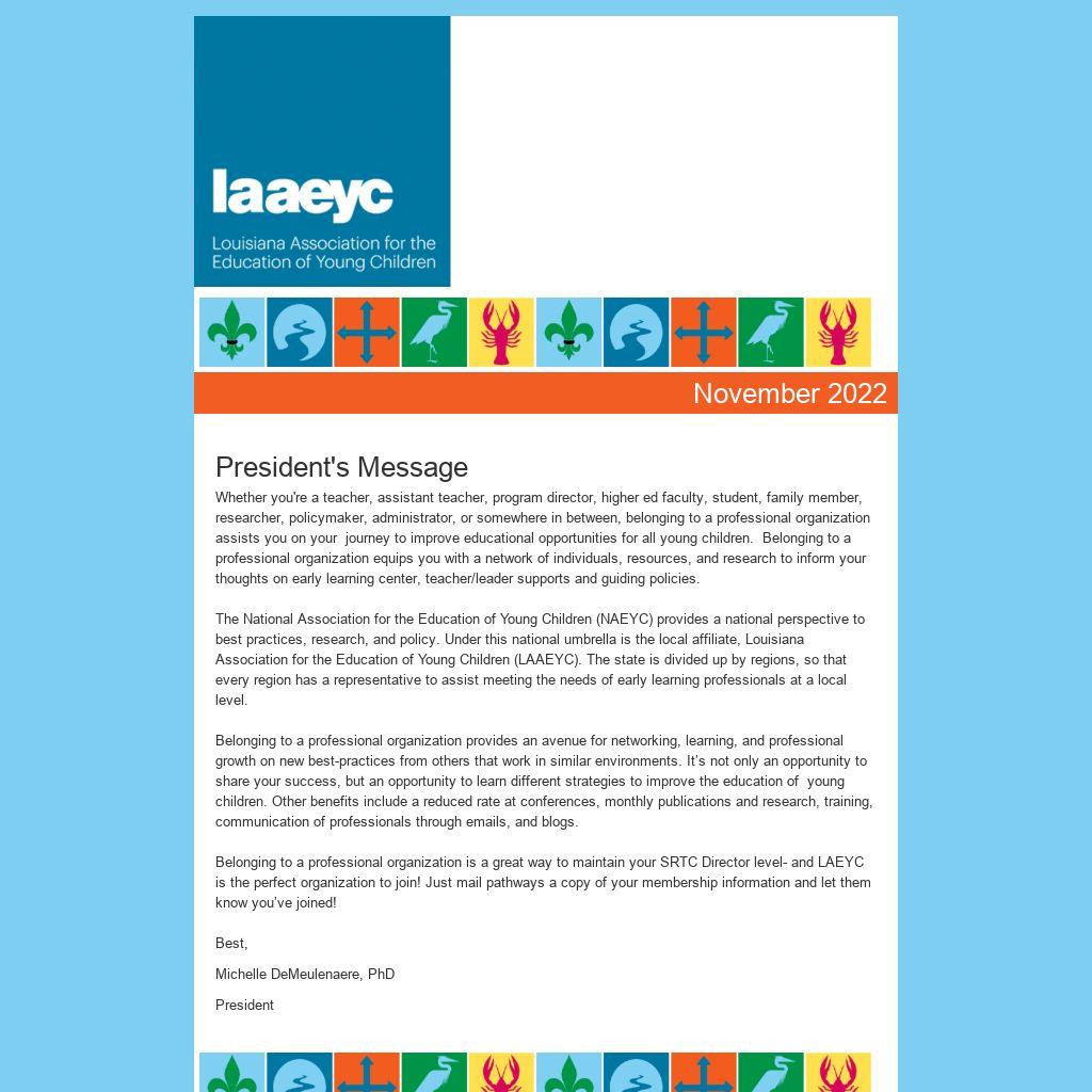 The National Association for the Education of Young Children (NAEYC) provides a national perspective to best practices, research, and policy. Under this national umbrella is the local affiliate, Louisiana Association for the Education of Young Children (LAAEYC). The state is divided up by regions, so that every region has a representative to assist meeting the needs of early learning professionals at a local level.
