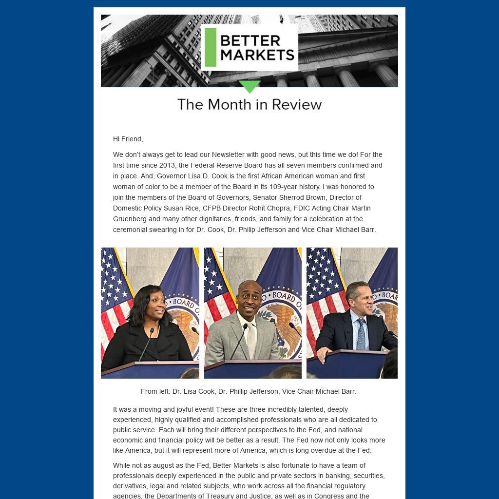 While not as august as the Fed, Better Markets is also fortunate to have a team of professionals deeply experienced in the public and private sectors in banking, securities, derivatives, legal and related subjects, who work across all the financial regulatory agencies, the Departments of Treasury and Justice, as well as in Congress and the White House. In the past several weeks and months we were pleased to bring on several new experts who will help us fight against injustice, inequality and predatory wealth extraction while fighting for broad-based wealth creation and lead to greater economic security, opportunity, and prosperity for all Americans.