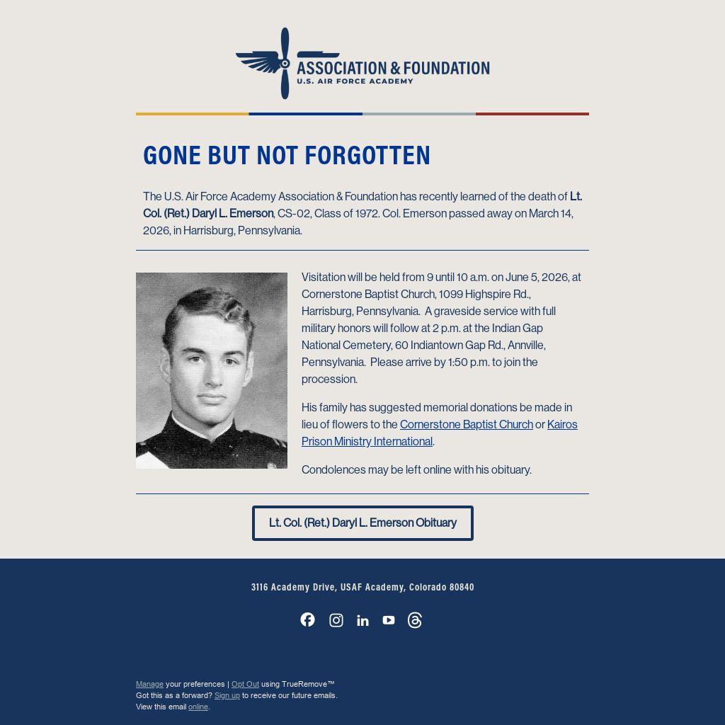 The U.S. Air Force Academy Association & Foundation has recently learned of the death of Lt. Col. (Ret.) Daryl L. Emerson, CS-02, Class of 1972. Col. Emerson passed away on March 14, 2026, in Harrisburg, Pennsylvania.