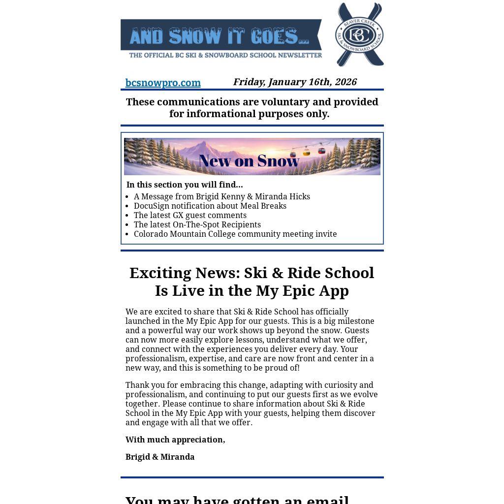 Thank you for embracing this change, adapting with curiosity and professionalism, and continuing to put our guests first as we evolve together. Please continue to share information about Ski & Ride School in the My Epic App with your guests, helping them discover and engage with all that we offer.