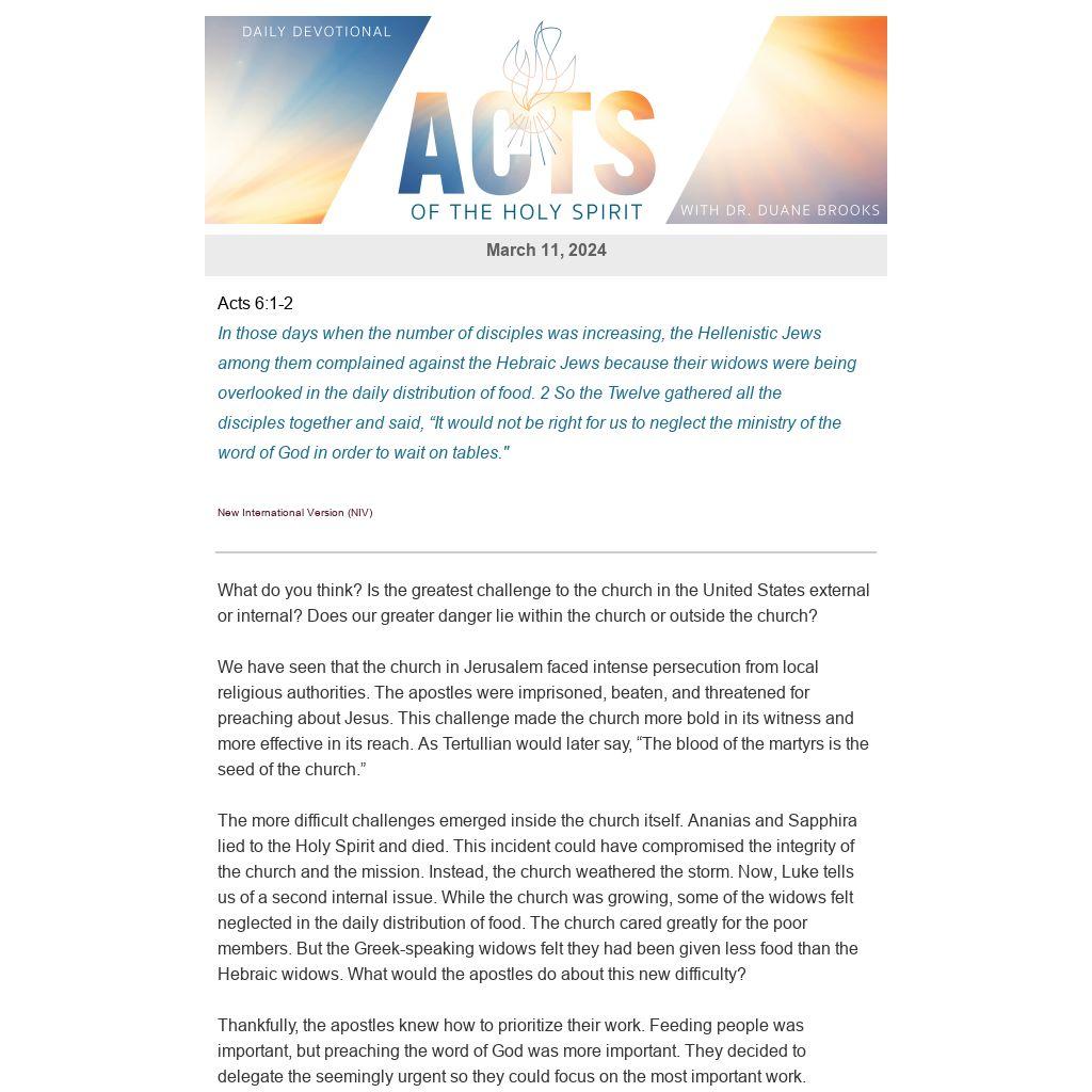 The more difficult challenges emerged inside the church itself. Ananias and Sapphira lied to the Holy Spirit and died. This incident could have compromised the integrity of the church and the mission. Instead, the church weathered the storm. Now, Luke tells us of a second internal issue. While the church was growing, some of the widows felt neglected in the daily distribution of food. The church cared greatly for the poor members. But the Greek-speaking widows felt they had been given less food than the Hebraic widows. What would the apostles do about this new difficulty?
