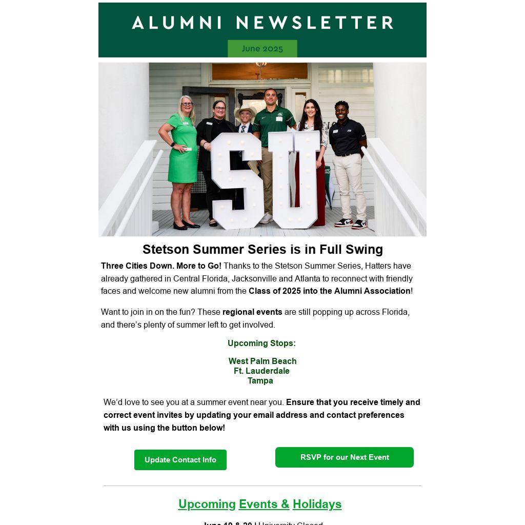 Three Cities Down. More to Go! Thanks to the Stetson Summer Series, Hatters have already gathered in Central Florida, Jacksonville and Atlanta to reconnect with friendly faces and welcome new alumni from the Class of 2025 into the Alumni Association!