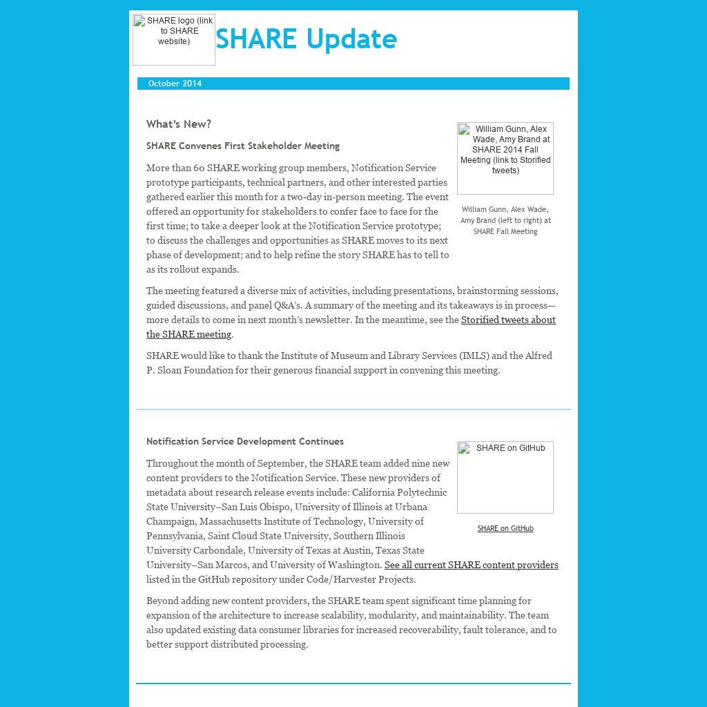 | What’s New? SHARE Convenes First Stakeholder Meeting More than 60 SHARE working group members, Notification Service prototype participants, technical partners, and other interested parties gathered earlier this month for a two-day in-person meeting. The event offered an opportunity for stakeholders to confer face to face for the first time; to take a deeper look at the Notification Service prototype; to discuss the challenges and opportunities as SHARE moves to its next phase of development; and to help refine the story SHARE has to tell to as its rollout expands. The meeting featured a diverse mix of activities, including presentations, brainstorming sessions, guided discussions, and panel Q&A’s. A summary of the meeting and its takeaways is in process—more details to come in next month’s newsletter. In the meantime, see the Storified tweets about the SHARE meeting. SHARE would like to thank the Institute of Museum and Library Services (IMLS) and the Alfred P. Sloan Foundation for their generous financial support in convening this meeting.