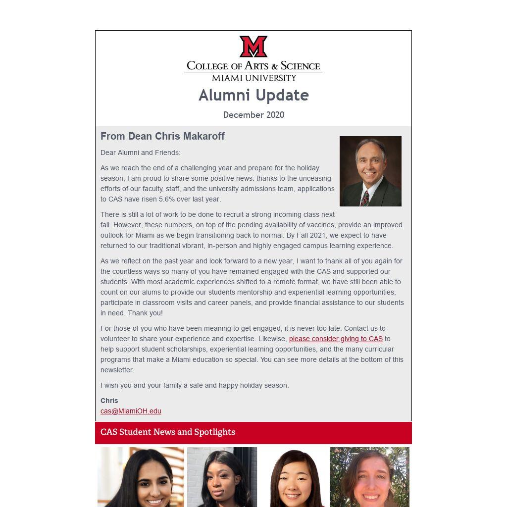 For those of you who have been meaning to get engaged, it is never too late. Contact us to volunteer to share your experience and expertise. Likewise, please consider giving to CAS to help support student scholarships, experiential learning opportunities, and the many curricular programs that make a Miami education so special. You can see more details at the bottom of this newsletter.