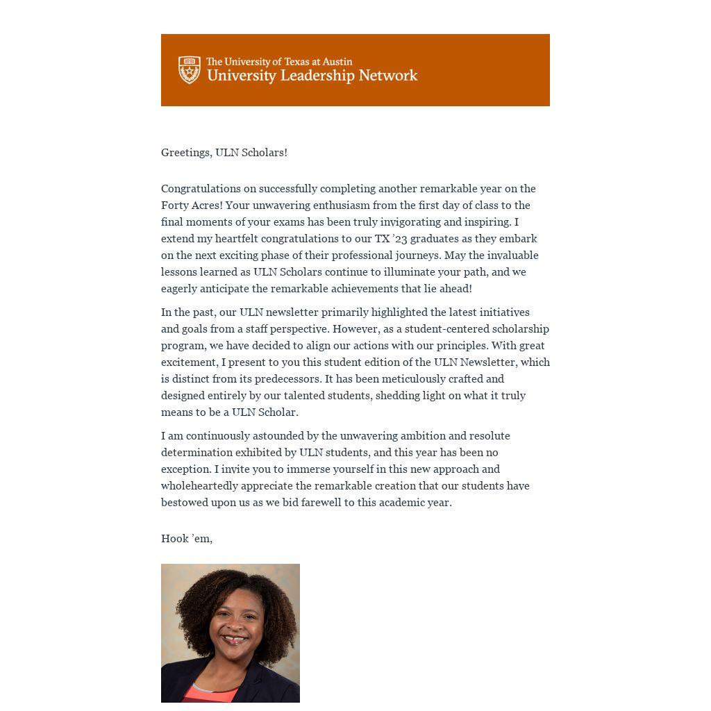Congratulations on successfully completing another remarkable year on the Forty Acres! Your unwavering enthusiasm from the first day of class to the final moments of your exams has been truly invigorating and inspiring. I extend my heartfelt congratulations to our TX ’23 graduates as they embark on the next exciting phase of their professional journeys. May the invaluable lessons learned as ULN Scholars continue to illuminate your path, and we eagerly anticipate the remarkable achievements that lie ahead!