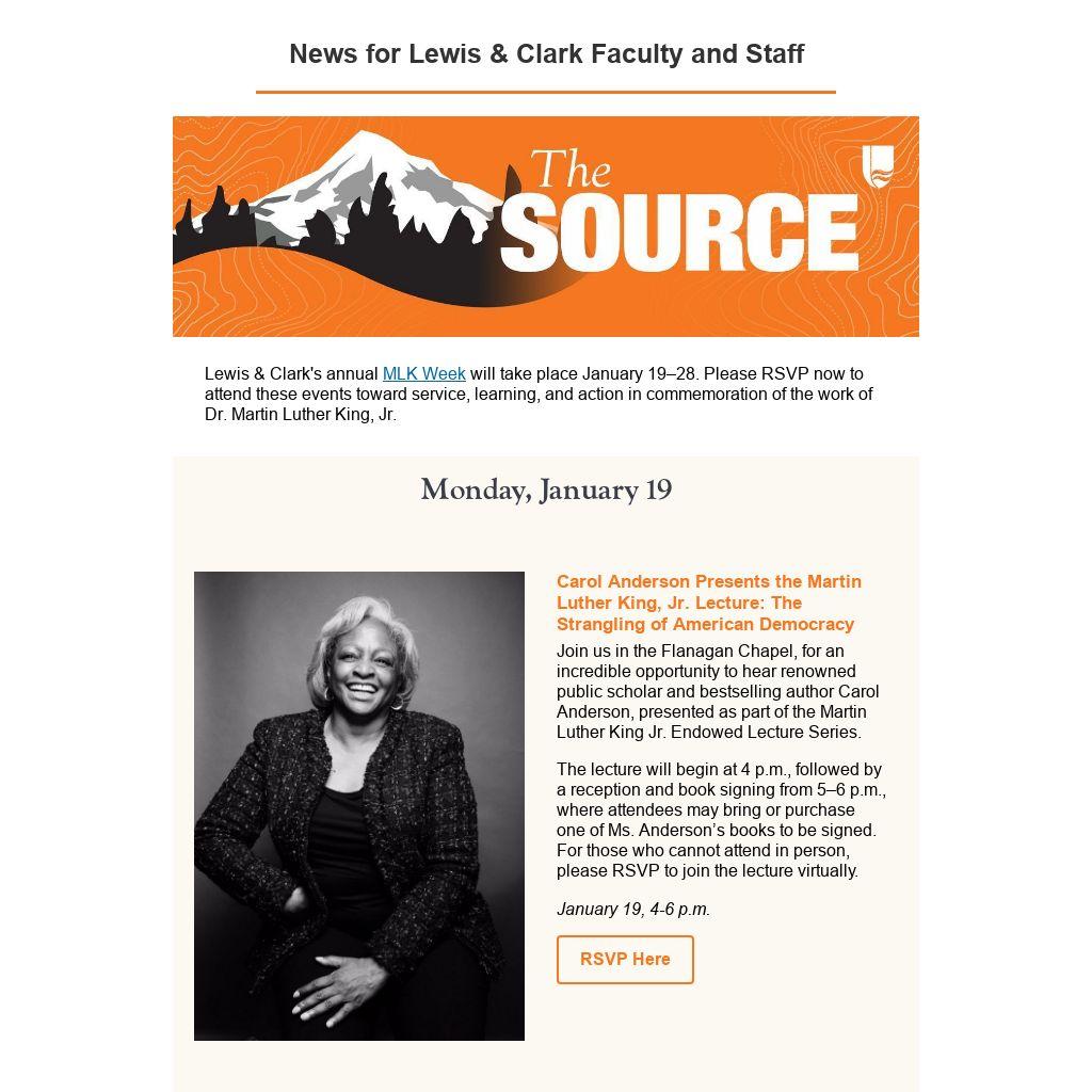 The Source is produced by Lewis & Clark's Office of Communications, and is distributed weekly to lc-employees@lclark.edu. Please write to us with your ideas, stories, and events—including specific date requests for promotion. Although there is no option for employees to unsubscribe, please do not mark this email as spam as doing so may negatively impact Lewis & Clark's reputation with Google as a trustworthy sender. Learn more about Lewis & Clark’s efforts to protect the email reputation of our lclark.edu domain.