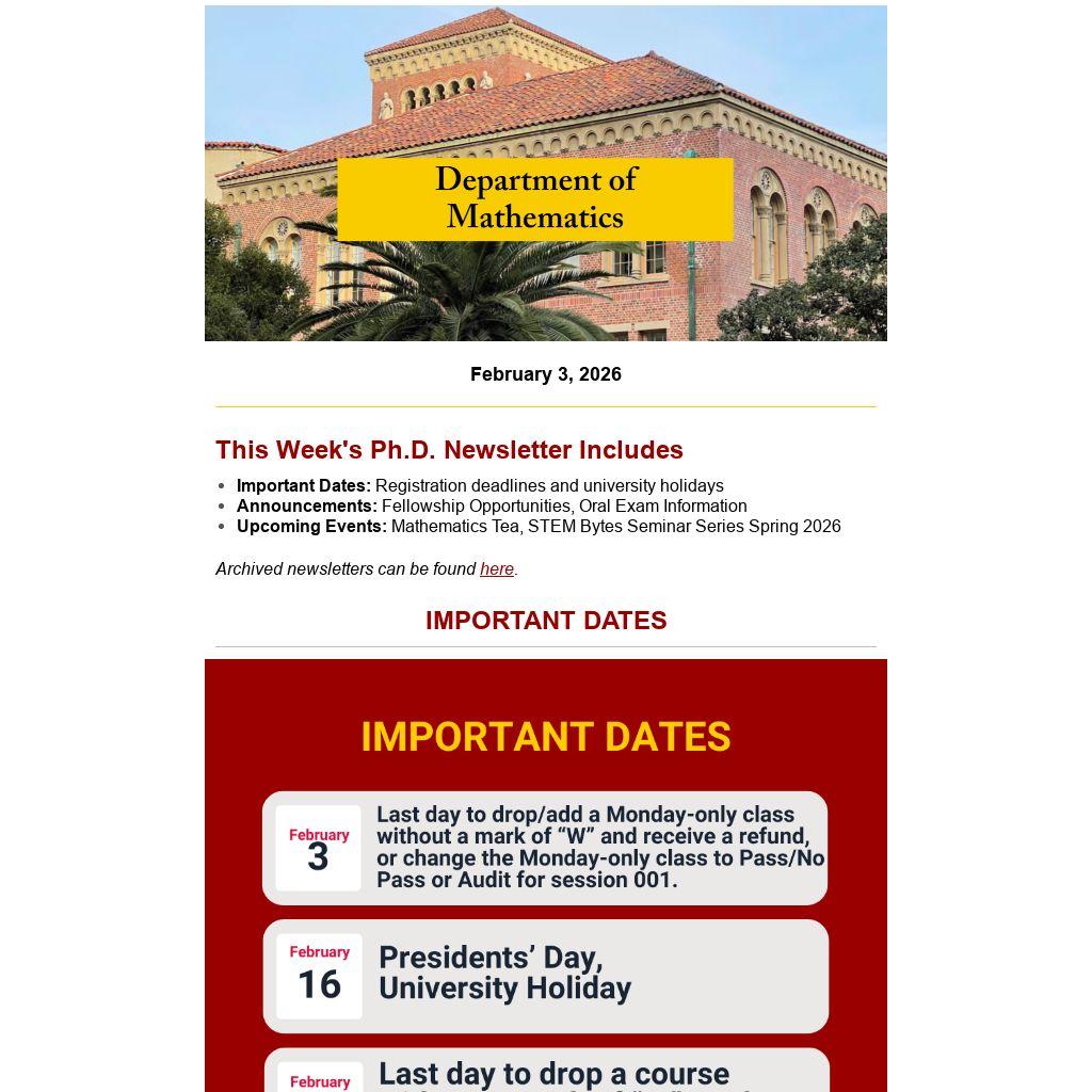 The USC Graduate School has announced fellowship opportunities for continuing PhD students in the 2026-2027 academic year. These opportunities are intended to provide enhanced support for students as their funding needs evolve, particularly for those in the later stages of their programs.