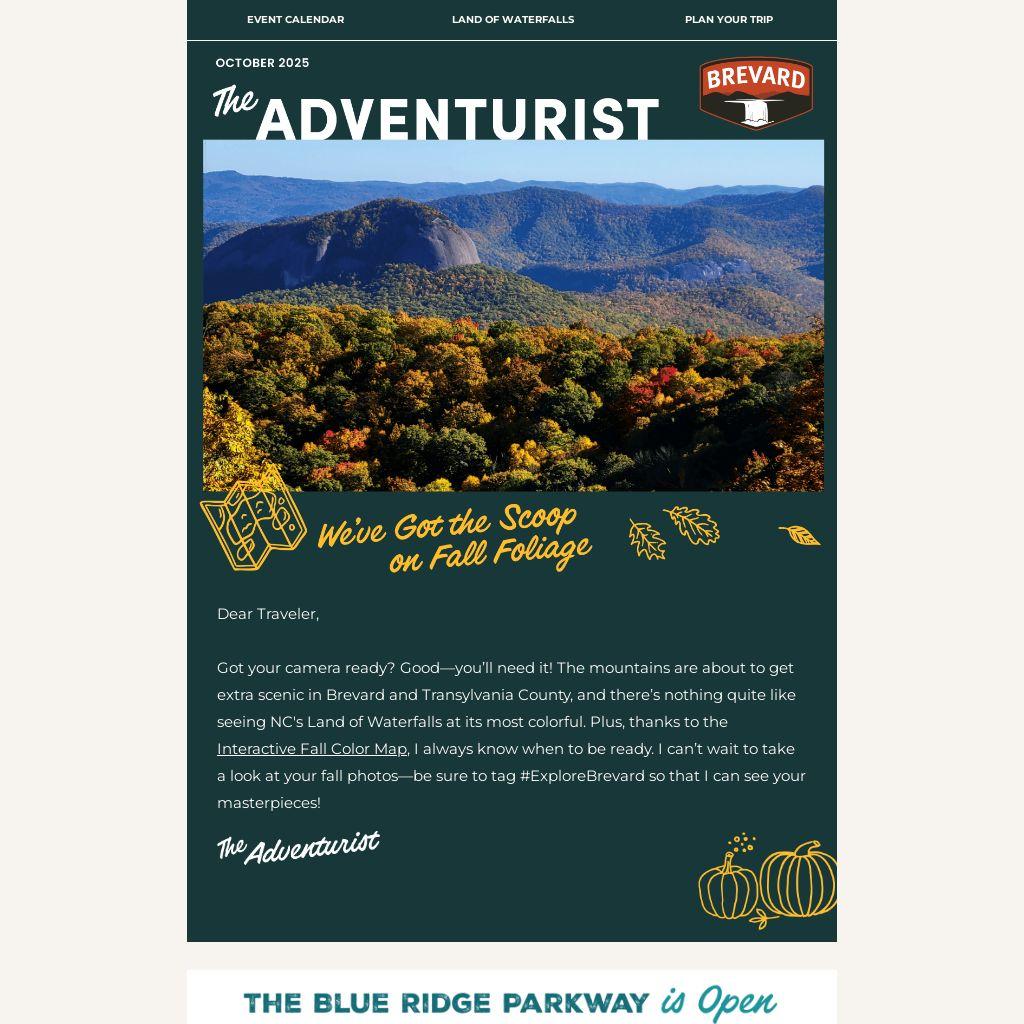 We want to see your autumn adventures! Got a cute selfie next to Looking Glass, or a sweeping panoramic shot from the Parkway? Tag us #ExploreBrevard! We may just share your photos on our socials, @ExploreBrevard.