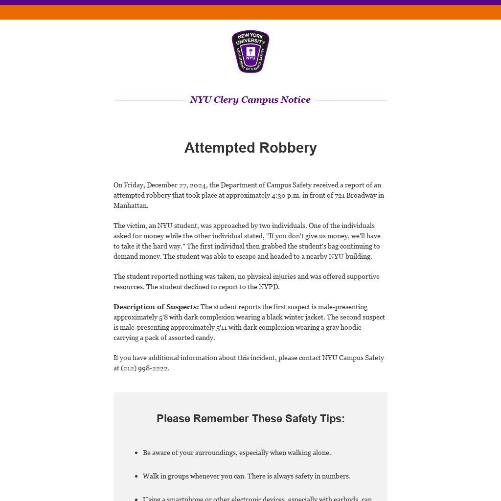 On Friday, December 27, 2024, the Department of Campus Safety received a report of an attempted robbery that took place at approximately 4:30 p.m. in front of 721 Broadway in Manhattan.