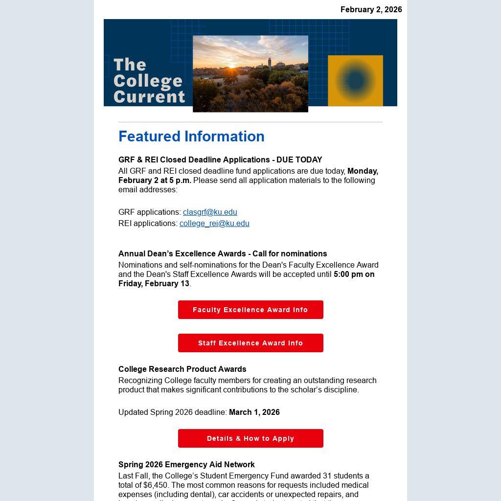 The Executive Dean will deliver the annual State of the College address on Wednesday, April 1 at 4 p.m. at the Jayhawk Welcome Center, Berkeley Room.