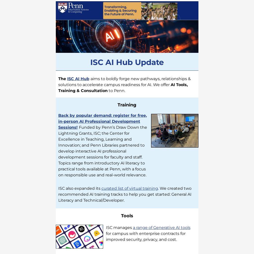 The ISC AI Hub aims to boldly forge new pathways, relationships & solutions to accelerate campus readiness for AI. We offer AI Tools, Training & Consultation to Penn.