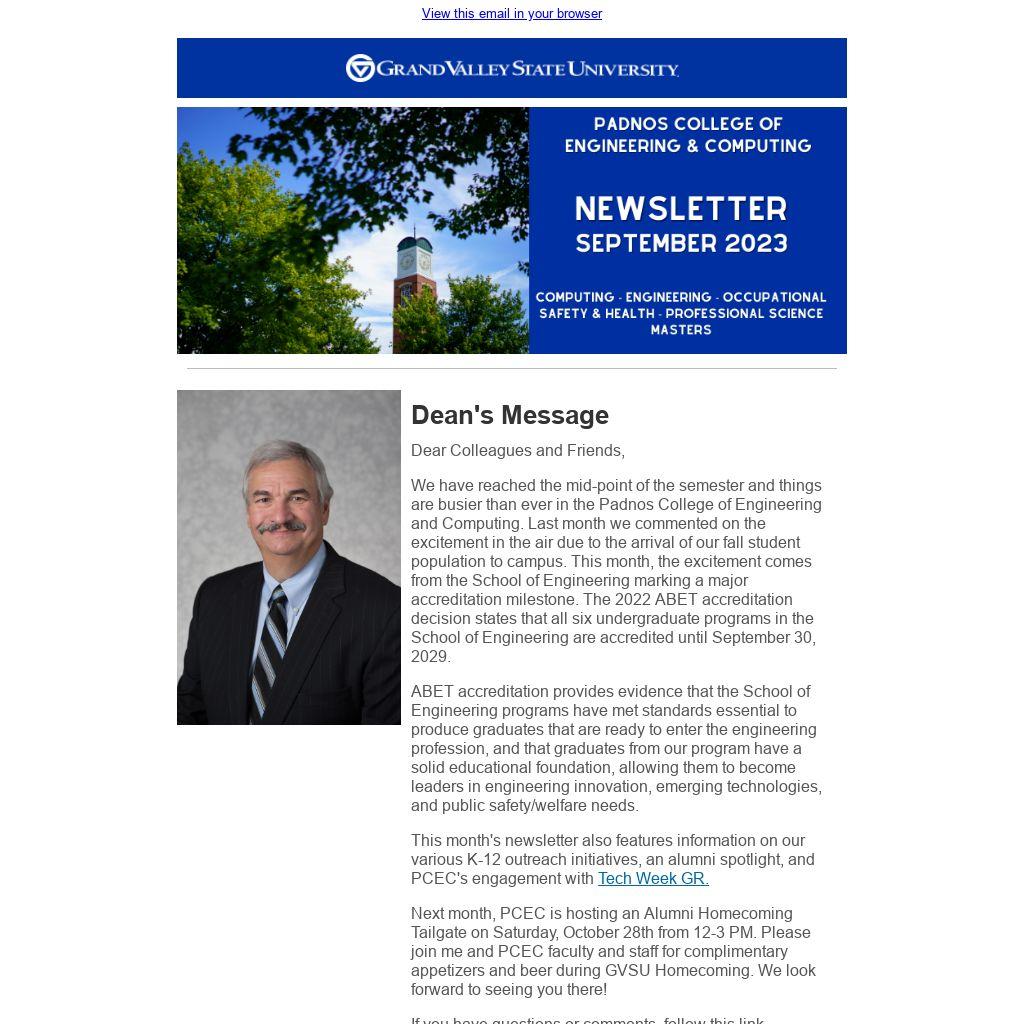 We have reached the mid-point of the semester and things are busier than ever in the Padnos College of Engineering and Computing. Last month we commented on the excitement in the air due to the arrival of our fall student population to campus. This month, the excitement comes from the School of Engineering marking a major accreditation milestone. The 2022 ABET accreditation decision states that all six undergraduate programs in the School of Engineering are accredited until September 30, 2029.