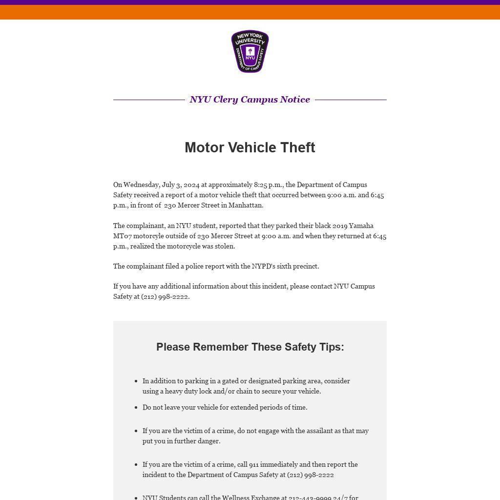 On Wednesday, July 3, 2024 at approximately 8:25 p.m., the Department of Campus Safety received a report of a motor vehicle theft that occurred between 9:00 a.m. and 6:45 p.m., in front of 230 Mercer Street in Manhattan.