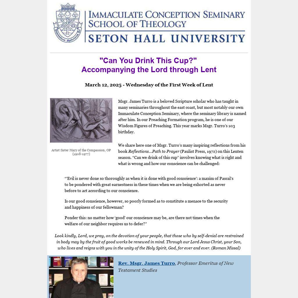 We share here one of Msgr. Turro’s many inspiring reflections from his book Reflections...Path to Prayer (Paulist Press, 1972) on this Lenten season. “Can we drink of this cup” involves knowing what is right and what is wrong and how our conscience can be challenged: