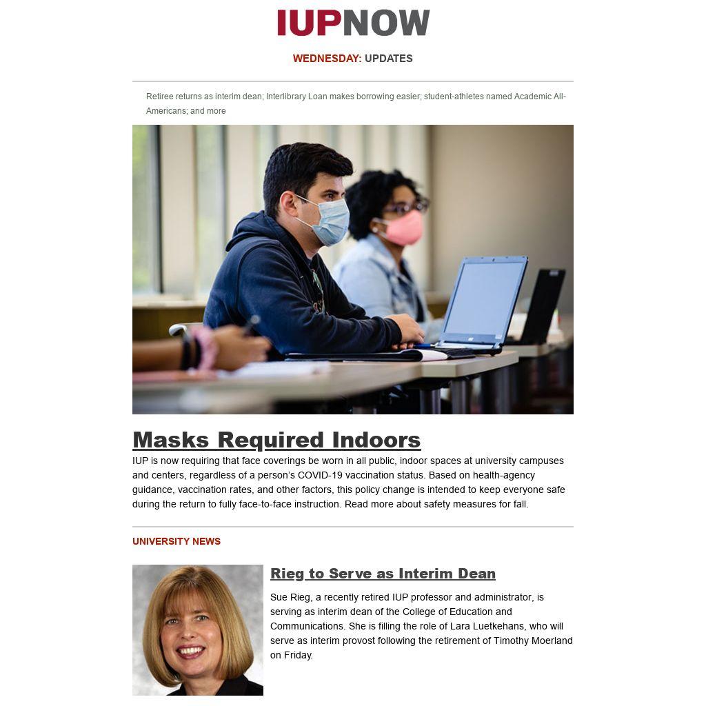 Distributed to IUP employees and students three days a week on its summer schedule, IUP Now is the official newsletter of Indiana University of Pennsylvania. It features news from across the IUP website, compiled by the Division of Marketing and Communications. Find out how to get your news and events in IUP Now.