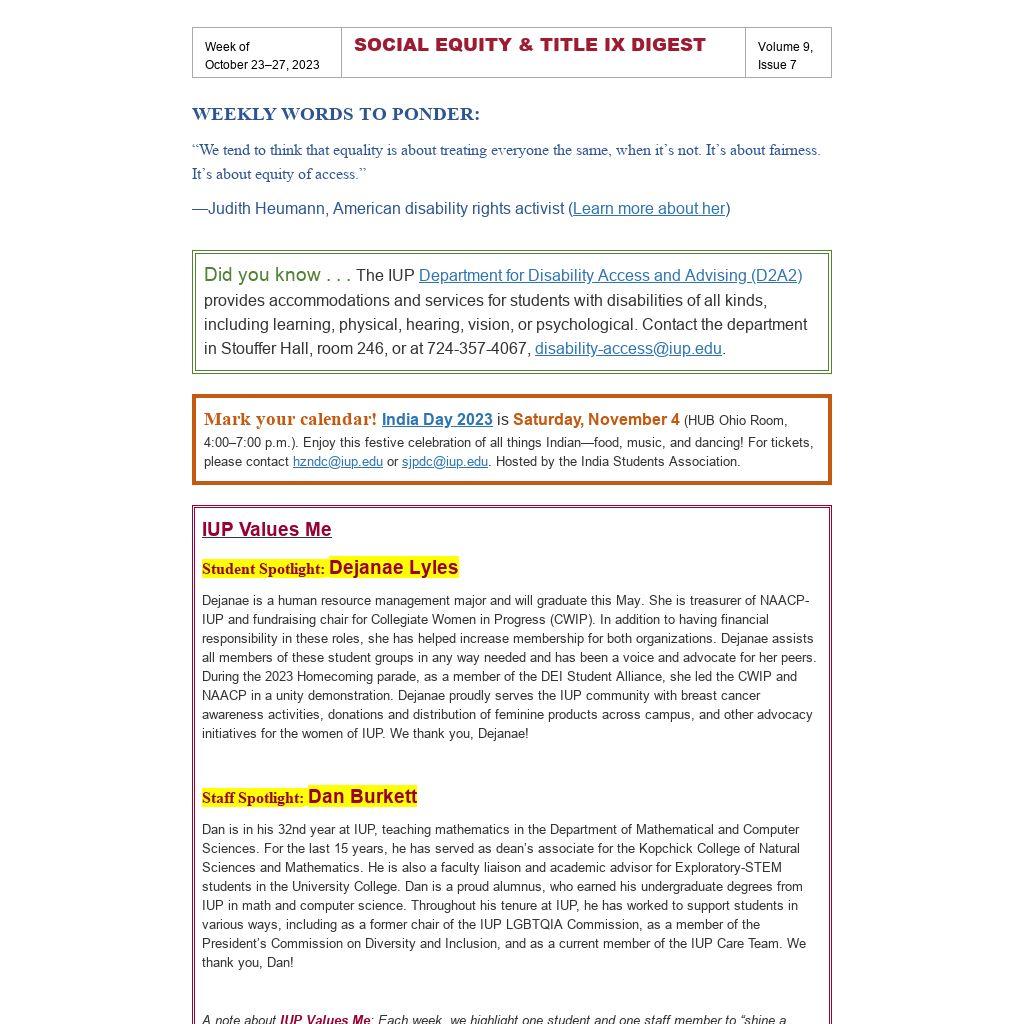 Digest issues are typically emailed every Monday morning. Send all information concerning your event to social-equity@iup.edu, and we will include it in the appropriate weekly issue. And, please be sure to enter your event in the CMS through the DIVERSITY, STUDENT, and CENTRAL CALENDARS so that it will receive wider marketing and achieve greater attendance.