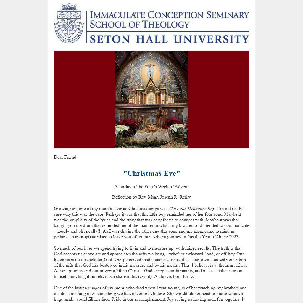 Rev. Msgr. Joseph Reilly, S.T.L., Ph.D., former Rector/Dean, Immaculate Conception Seminary School of Theology. He holds a Bachelor of Sacred Theology from Pontifical Gregorian University, Rome, a licentiate in Sacred Theology (STL) from Pontificio Istituto Teresianum, Rome, and a Ph.D. in Educational Administration from Fordham University. He has served as a member of the Archdiocesan Priest Personnel Board, the Advisory Committee on Continuing Education and Ongoing Formation of Priests, the Archdiocesan Vocations Board, and the Board of Trustees of Seton Hall University. Pope John Paul II named him a Chaplain to His Holiness in 2005, with the title of Reverend Monsignor. In 2016 during the Holy Year of Mercy, the Pontifical Council for Promoting New Evangelization sought priests who were living signs "of the Father's welcome to all those in search of His forgiveness." He was the only priest from the Archdiocese of Newark formally commissioned as a Missionary of Mercy by Pope Francis.
