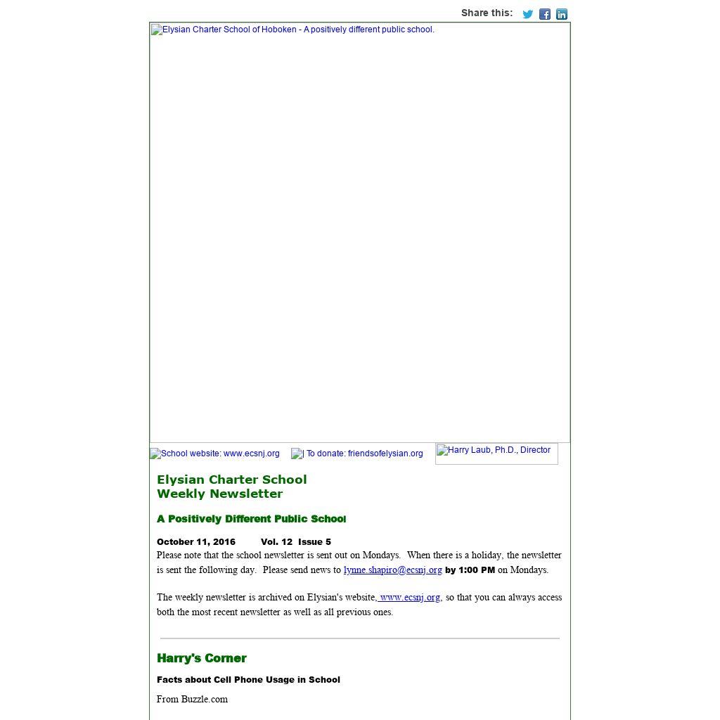 The weekly newsletter is archived on Elysian's website, www.ecsnj.org, so that you can always access both the most recent newsletter as well as all previous ones.