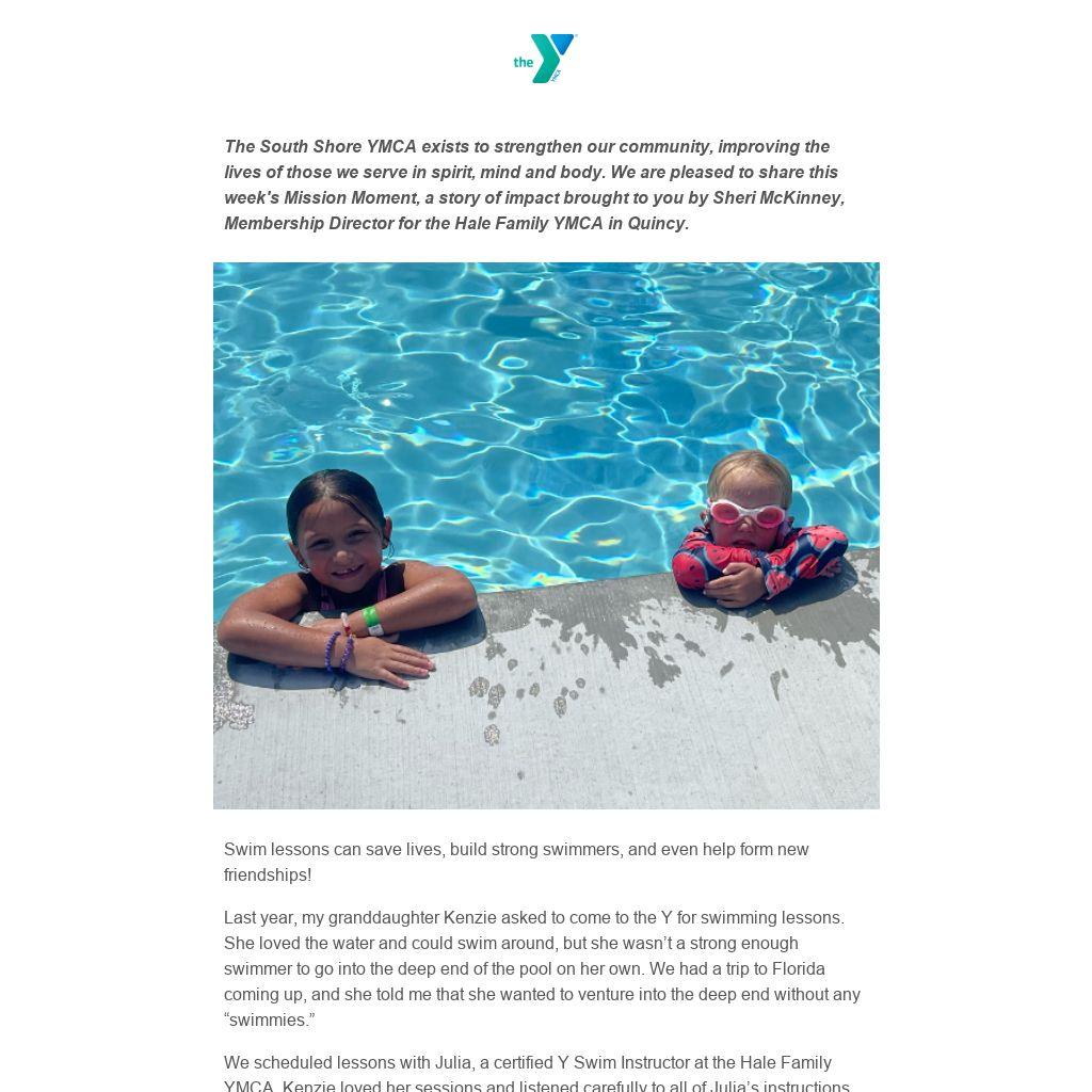 Last year, my granddaughter Kenzie asked to come to the Y for swimming lessons. She loved the water and could swim around, but she wasn’t a strong enough swimmer to go into the deep end of the pool on her own. We had a trip to Florida coming up, and she told me that she wanted to venture into the deep end without any “swimmies.”