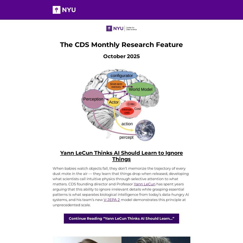 When babies watch objects fall, they don’t memorize the trajectory of every dust mote in the air — they learn that things drop when released, developing what scientists call intuitive physics through selective attention to what matters. CDS founding director and Professor Yann LeCun has spent years arguing that this ability to ignore irrelevant details while grasping essential patterns is what separates biological intelligence from today’s data-hungry AI systems, and his team’s new V-JEPA 2 model demonstrates this principle at unprecedented scale.