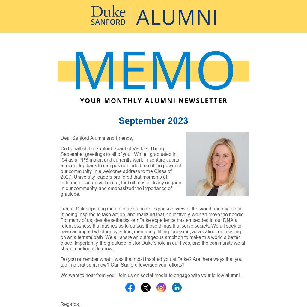 On behalf of the Sanford Board of Visitors, I bring September greetings to all of you. While I graduated in ‘94 as a PPS major, and currently work in venture capital, a recent trip back to campus reminded me of the power of our community. In a welcome address to the Class of 2027, University leaders proffered that moments of faltering or failure will occur, that all must actively engage in our community, and emphasized the importance of gratitude.