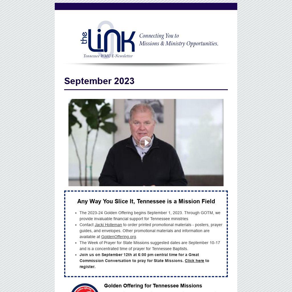 - Join us on September 12th at 6:00 pm central time for a Great Commission Conversation to pray for State Missions. Click here to register.