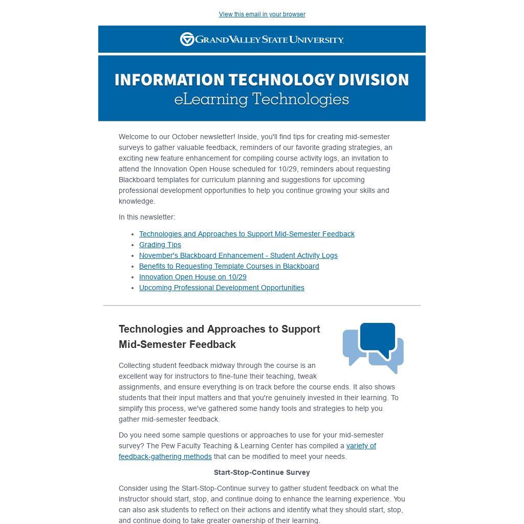 Welcome to our October newsletter! Inside, you'll find tips for creating mid-semester surveys to gather valuable feedback, reminders of our favorite grading strategies, an exciting new feature enhancement for compiling course activity logs, an invitation to attend the Innovation Open House scheduled for 10/29, reminders about requesting Blackboard templates for curriculum planning and suggestions for upcoming professional development opportunities to help you continue growing your skills and knowledge.