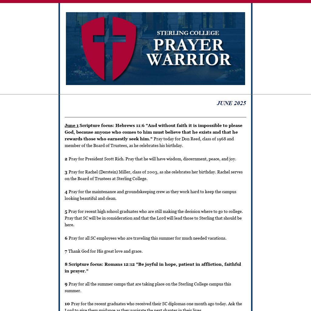 13 Pray that our alumni and friends will have warm hearts towards Sterling College. Pray that they would be moved to pray for the college often and that they would have great generosity in supporting the work and mission.